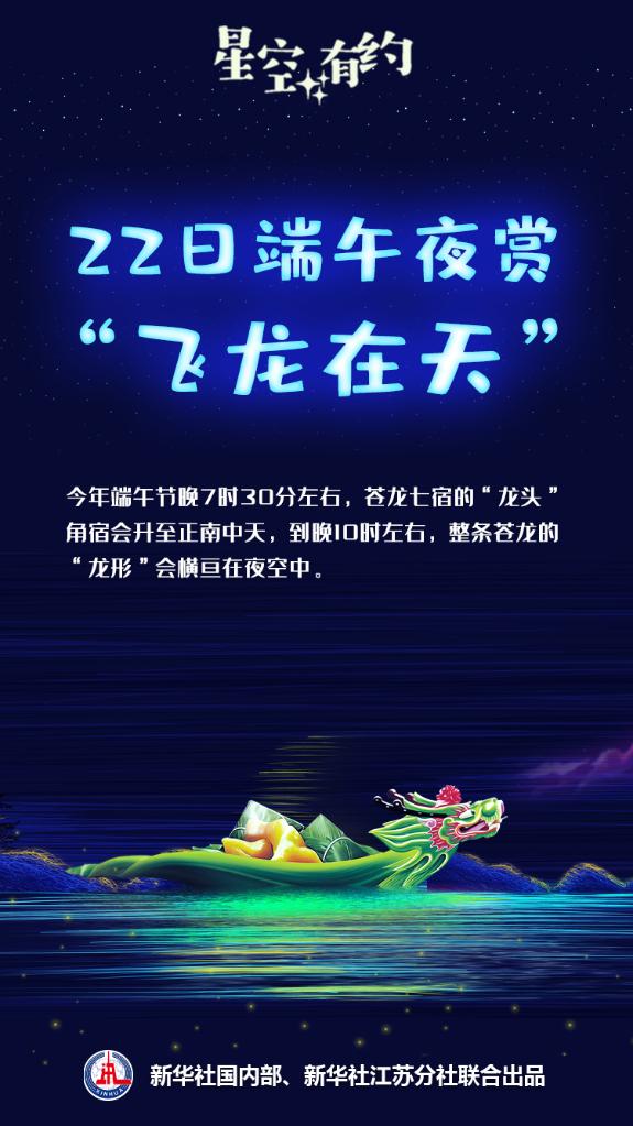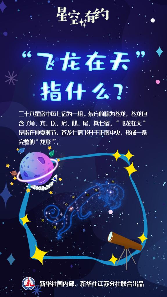 新华社南京6月20日电(记者王珏玢、朱筱)中科院天文科普专家介绍,22日端午节晚7时30分左右,苍龙七宿的“龙头”角宿会升至正南中天,到晚10时左右,整条苍龙的“龙形”会横亘在夜空中,公众可以观赏到“飞龙在天”天象。这条遨游在天上的“飞龙”是什么?“飞龙”是如何飞上天的?