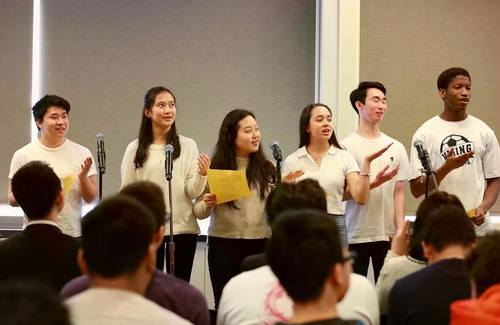 2019年4月3日,在美国伊利诺伊州北奈尔斯市,北奈尔斯高中的学生们现场中文朗诵唐代诗人李白的《静夜思》和孟浩然的《春晓》。