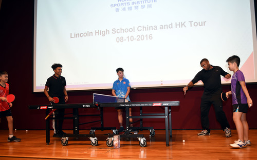 2016年10月8日,香港乒乓球运动员与林肯中学学生进行交流比赛。当日,来自美国华盛顿州塔科马市林肯中学的师生到访香港体育学院。