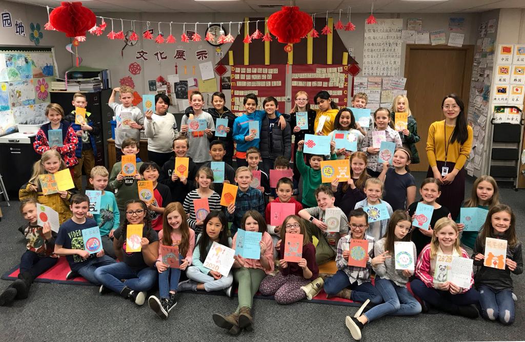 2020年1月21日,在美国犹他州奥勒姆,卡斯卡德小学师生展示为习主席制作的新年贺卡。