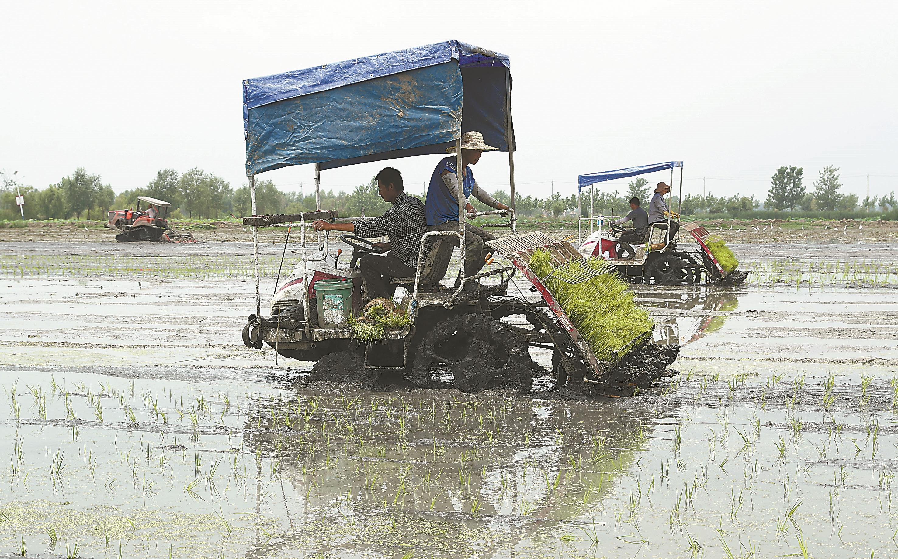 6月20日,蒙城县立仓镇展宏水产养殖专业合作社虾稻共作田里,农民正驾驶插秧机进行插秧。 本报通讯员 胡卫国 摄