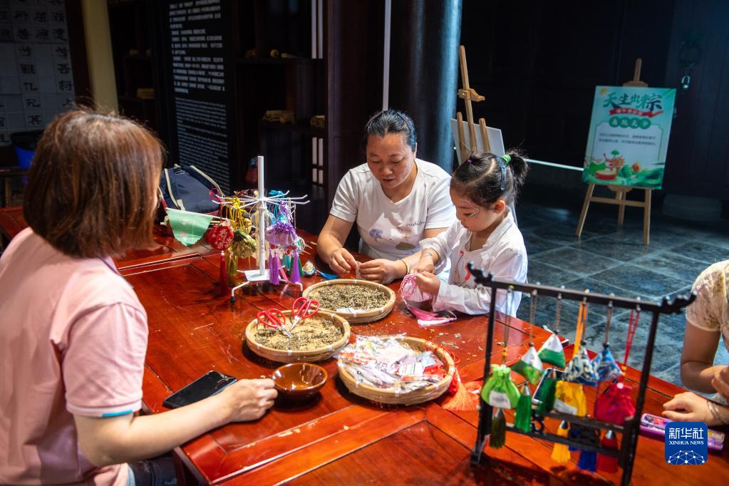 6月22日,在湖南省汨罗市屈子祠镇屈子文化园,游客在制作香囊。新华社记者 陈思汗 摄
