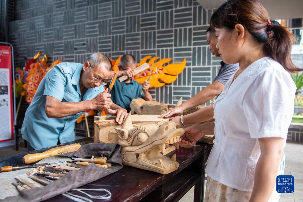 6月22日,在湖南省汨罗市屈子祠镇新义村,艺人向游客展示雕龙头技艺。新华社记者 陈思汗 摄