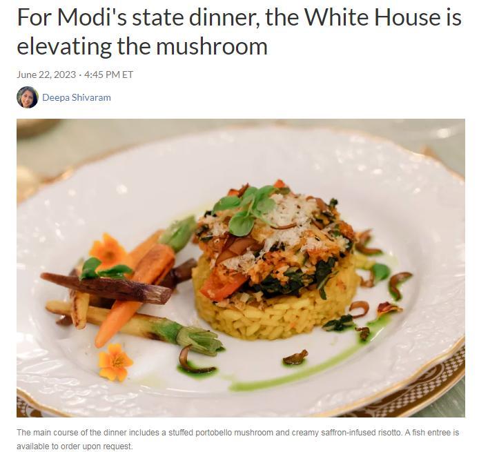 NPR的报道还介绍称,考虑到莫迪是一个严格的素食主义者,这场晚宴完全以素食为基础,菜品里没有肉类、奶制品和鸡蛋。