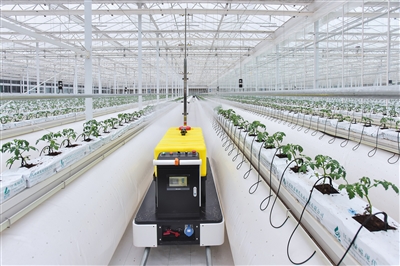 湖北省竹山县宝丰镇龙井村,在五福龙井智慧农业生态园,全自动植保机在玻璃温室内为番茄苗喷洒叶面肥和清水。