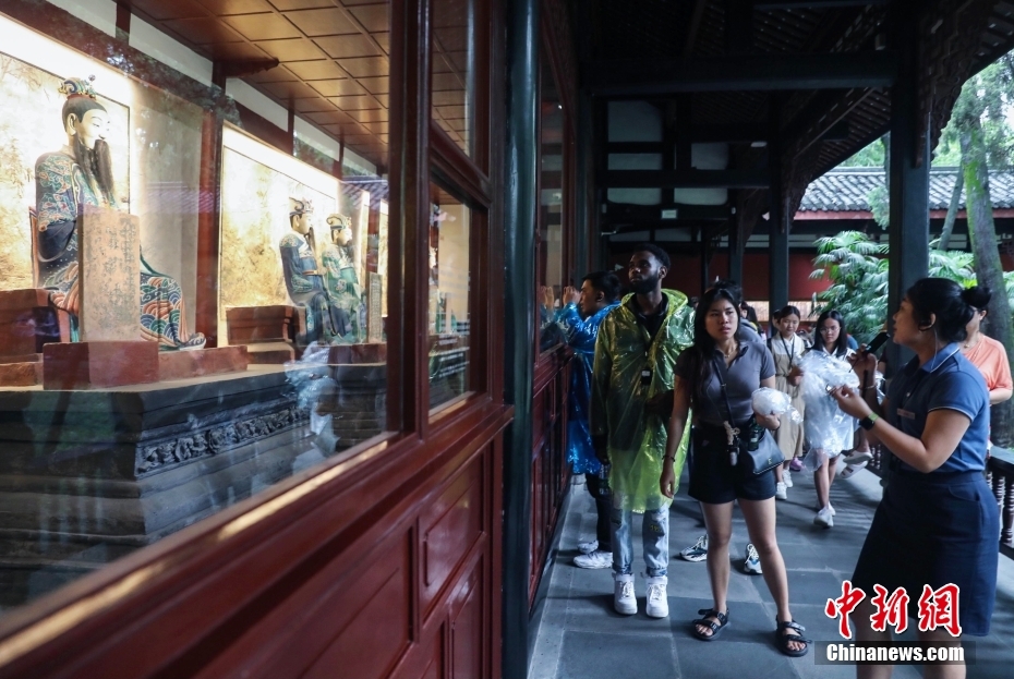 8月26日,“‘Z世代’画像中国”网络互动活动走进四川成都武侯祠博物馆,来自柬埔寨、古巴、马来西亚、菲律宾的五位“Z世代”青年参观武侯祠,了解三国历史。图为青年们参观武侯祠塑像。