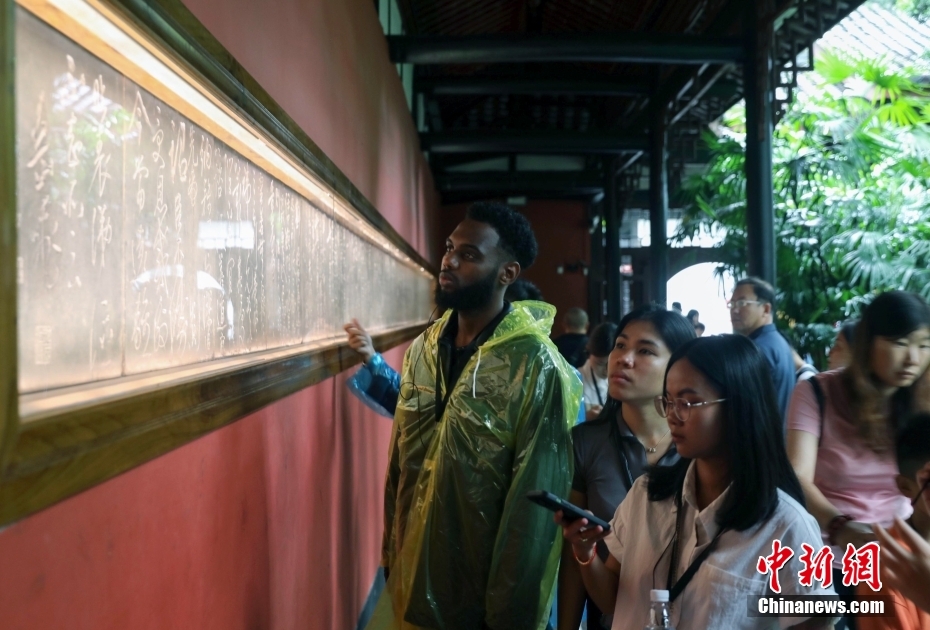 8月26日,“‘Z世代’画像中国”网络互动活动走进四川成都武侯祠博物馆,来自柬埔寨、古巴、马来西亚、菲律宾的五位“Z世代”青年参观武侯祠,了解三国历史。图为观看碑刻《出师表》。