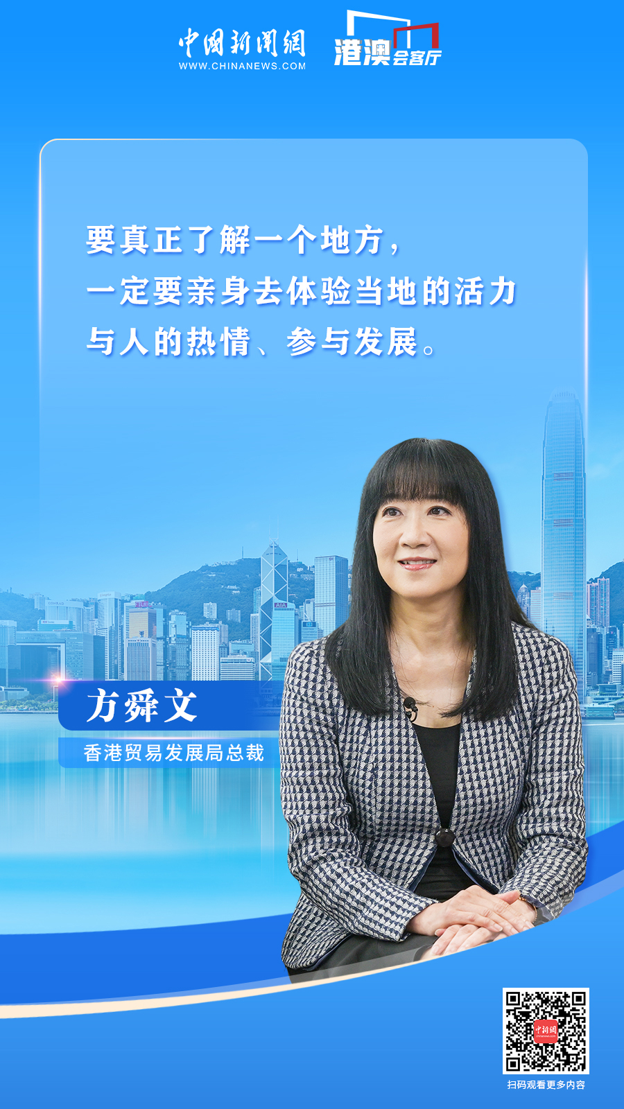 香港9月21日电 (记者 魏华都 范思忆 刘轩廷 罗嗣昱 梁源 陈永诺)加入香港贸易发展局(简称“香港贸发局”)前,方舜文曾长期在香港特区政府任职。她于2010年加入香港贸发局,2014年10月出任总裁,领导香港贸发局通过其全球网络,为以香港为基地的企业创造商机,促进香港对外贸易。