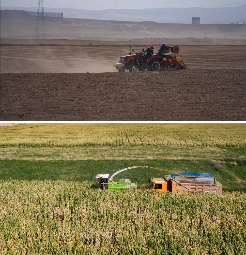 这是一张拼版照片:上图是农民在宁夏吴忠市同心县韦州镇铺设滴灌带(资料图片);下图是宁夏吴忠市同心县韦州镇现代高效节水灌溉项目建成后的高标准农田,收割机在收割玉米(2023年9月14日摄)。新华社记者 杨植森 摄