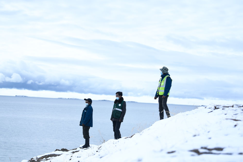 2021年10月20日,在青海省果洛藏族自治州玛多县扎陵湖乡勒那村,三江源国家公园黄河源园区生态管护员在扎陵湖畔巡护。新华社记者 李占轶 摄
