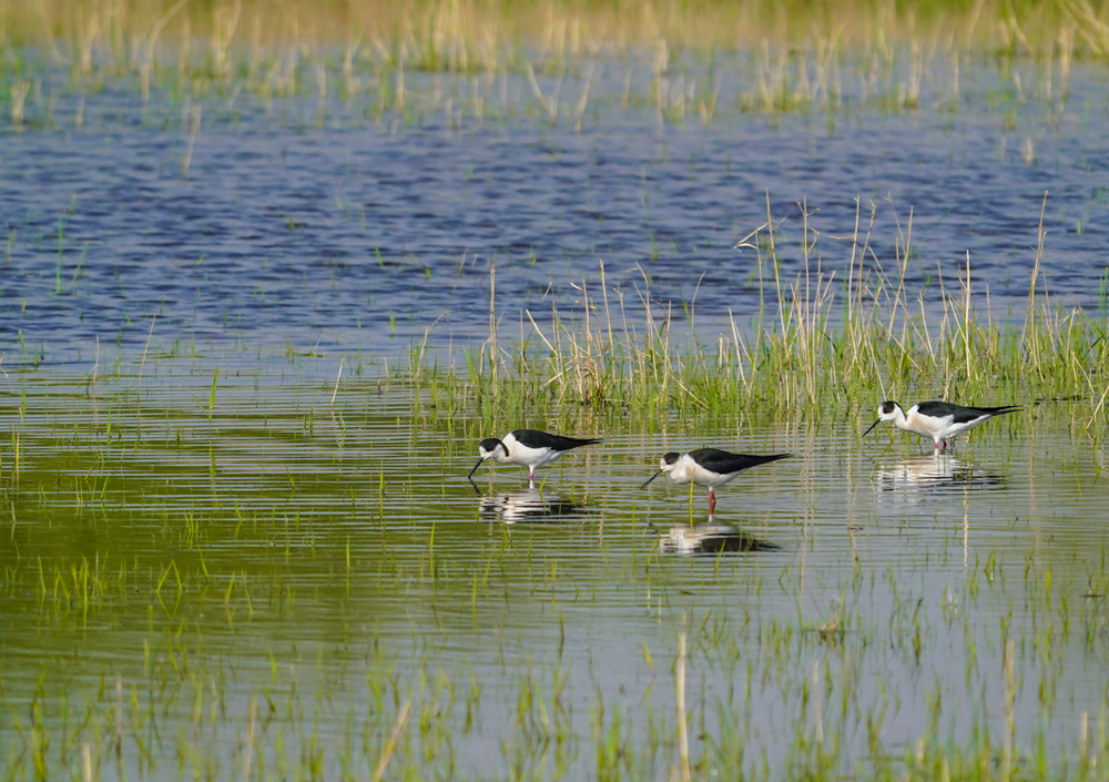 这是2023年3月30日拍摄的几只水鸟在山东省高青县蓑衣樊村附近的湿地觅食。新华社记者 邵琨 摄
