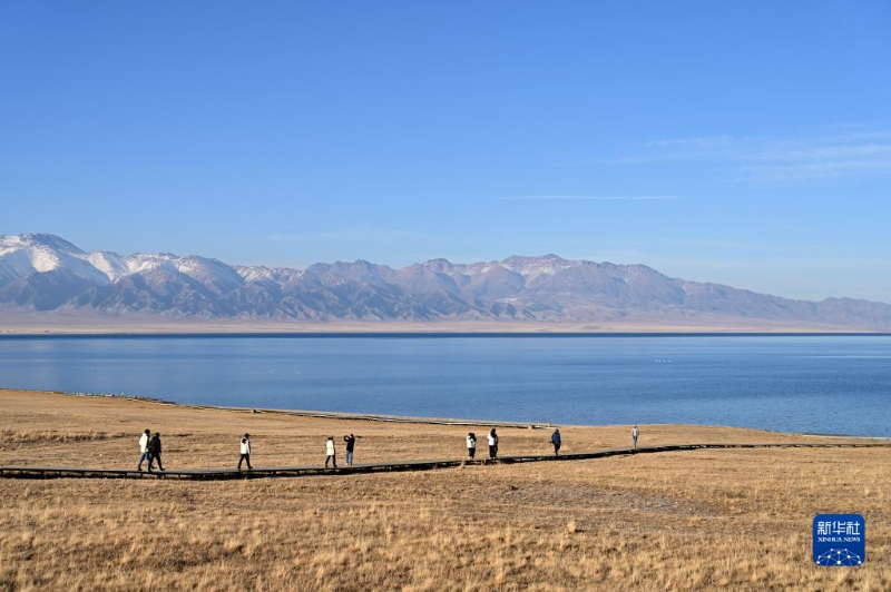 资料图片:游客在新疆赛里木湖边游玩