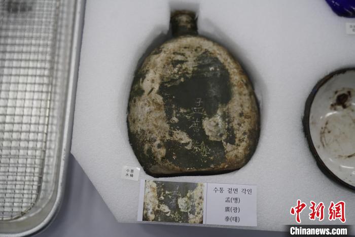 当地时间11月22日上午,第十批在韩中国人民志愿军烈士遗骸装殓仪式在韩国举行。图为装殓仪式现场拍摄的写有“孟广泰”名字的水壶。中新社记者 刘旭 摄