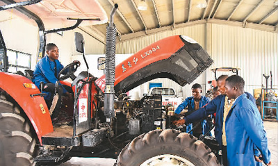 图为学生在喀麦隆亚巴西农业职业技术中学上拖拉机实践课。