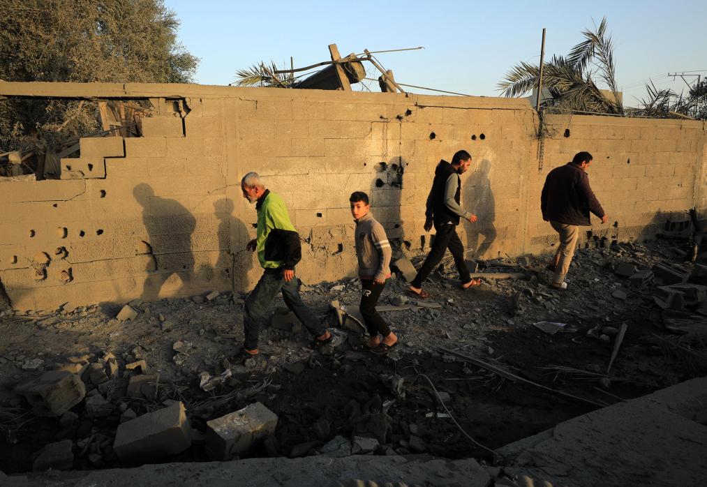 11月23日,在加沙地带南部的汗尤尼斯,人们从以军袭击后破损的街头走过。新华社发(亚西尔·库迪摄)