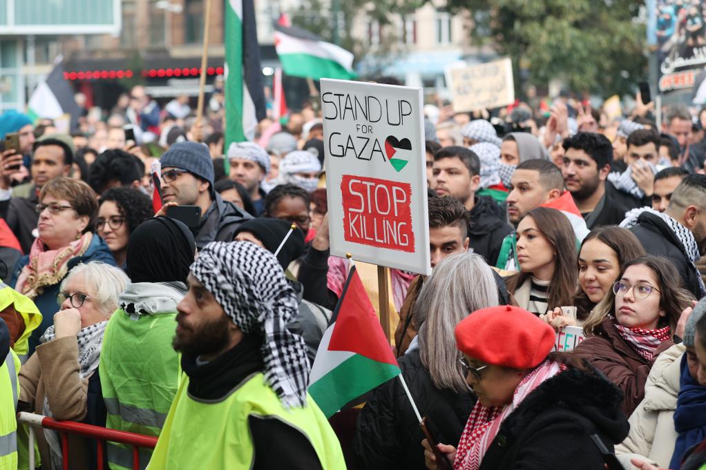 11月11日,众多巴勒斯坦支持者在比利时布鲁塞尔集会,呼吁尽快实现加沙停火。新华社记者 赵丁喆 摄