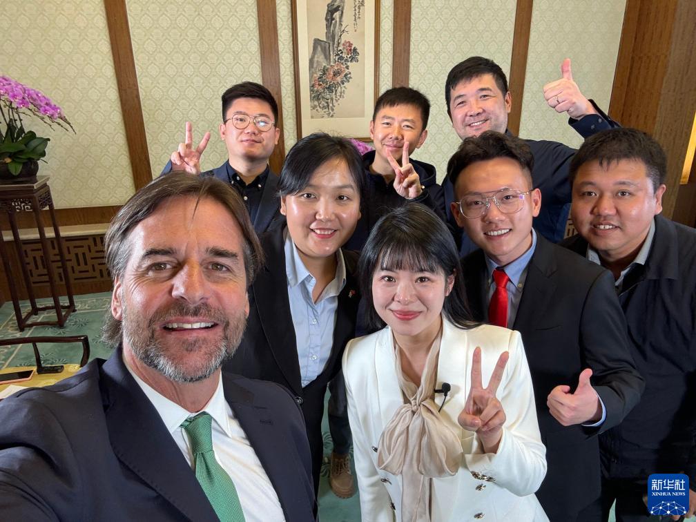 11月23日,乌拉圭总统拉卡列(左一)在北京接受专访后拿着手机与新华社记者和乌拉圭使馆工作人员自拍留念。新华社发(乌拉圭总统拉卡列摄)