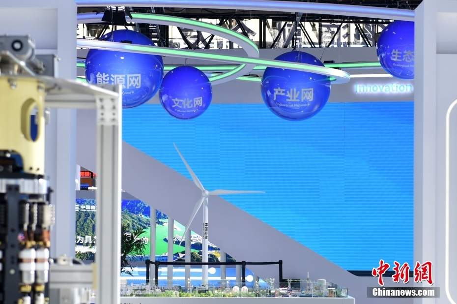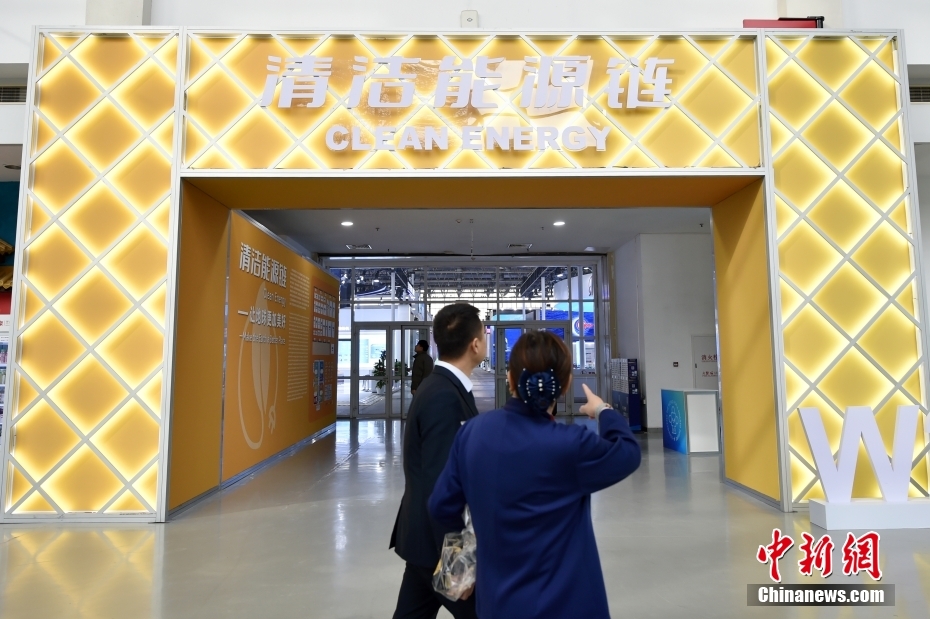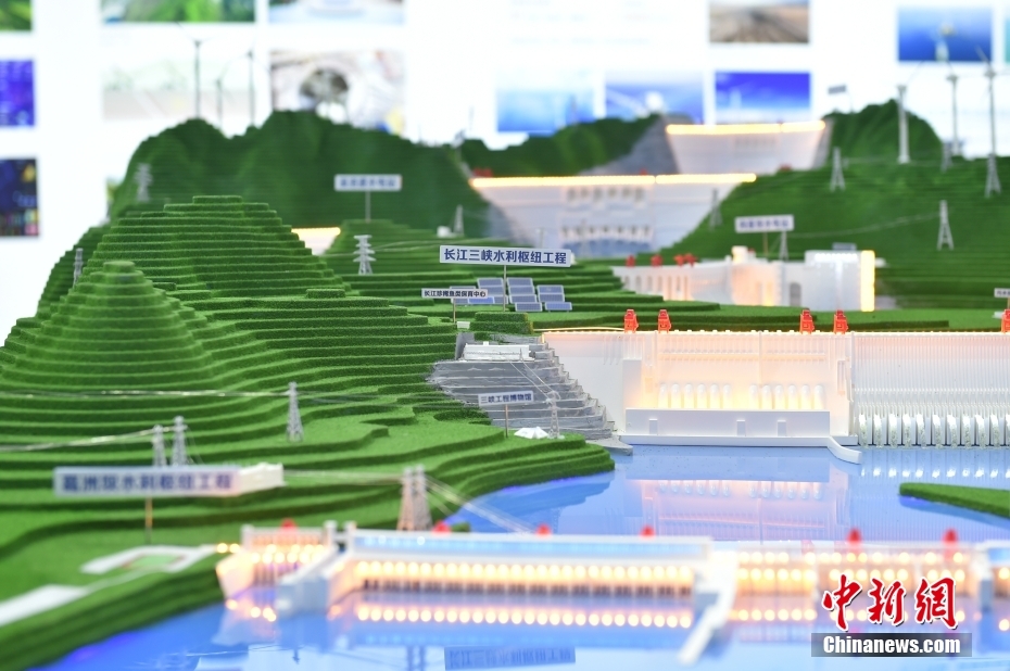 图为链博会清洁能源链展厅里,中国三峡展台上的“世界最大清洁能源走廊”沙盘。