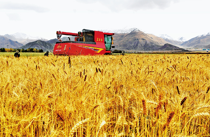 近年来,西藏自治区积极实施耕地改造,通过开展高标准农田建设,全方位提升耕地质量与粮食产量,夯实粮食安全基础。图为工作人员驾驶农业机械在拉萨市林周县曲果强村的高标准农田里收获小麦(2023年10月12日摄)。 新华社记者 张汝锋/摄