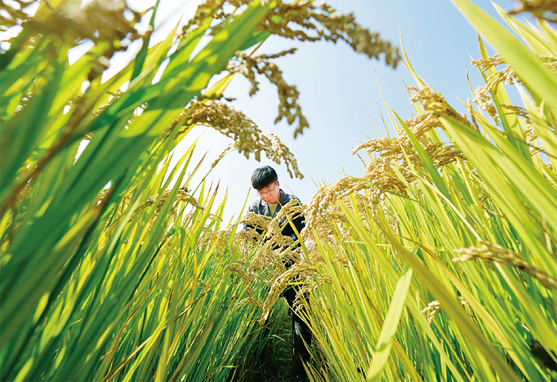 近年来,河北省唐山市通过盐碱地土壤科学改良、耐碱作物品种培育、适用耕作技术研究应用等系列治理措施,在盐碱地上开发建设了高标准农田88.6万亩,有效提高盐碱地利用水平。图为2023年10月11日,农业科研人员在唐山市曹妃甸区第五农场盐碱地改良而成的高标准稻田内工作。 新华社记者 杨世尧/摄