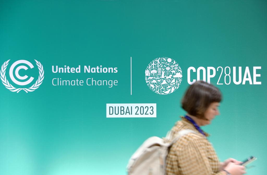 图为2023年12月1日,在阿联酋迪拜的联合国气候变化大会举办场地,一名参会者路过大会标识。(新华社记者王东震摄)