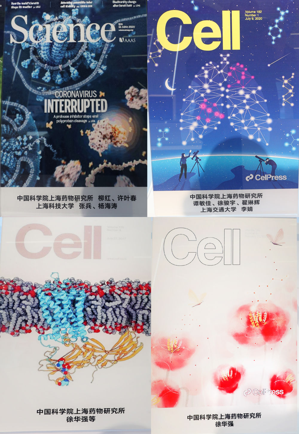 拼版照片是2023年11月29日在上海科技创新成果展上拍摄的以中国科学院上海药物研究所科研成果为封面的刊物。新华社记者 方喆 摄
