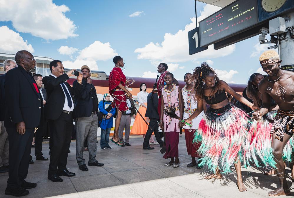 受肯尼亚铁路局邀请,俄罗斯、南非、伊朗、沙特阿拉伯等国驻肯使节10月6日参观蒙内铁路调度中心,并乘坐列车从首都内罗毕到肯尼亚港口城市蒙巴萨。这是多国驻肯使节当天在蒙内铁路内罗毕站观看文艺演出。新华社记者 王冠森 摄
