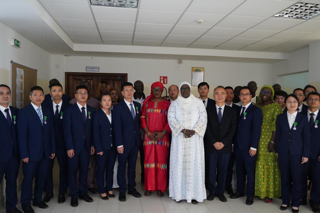 11月2日,在塞内加尔首都达喀尔,塞内加尔卫生和社会行动部长恩迪亚耶与中国医疗队队员在仪式后合影。塞内加尔政府当天为中国第19批援塞医疗队全体队员颁发勋章和荣誉证书,以表彰他们为塞医疗卫生事业作出的卓越贡献。新华社记者 王子正 摄
