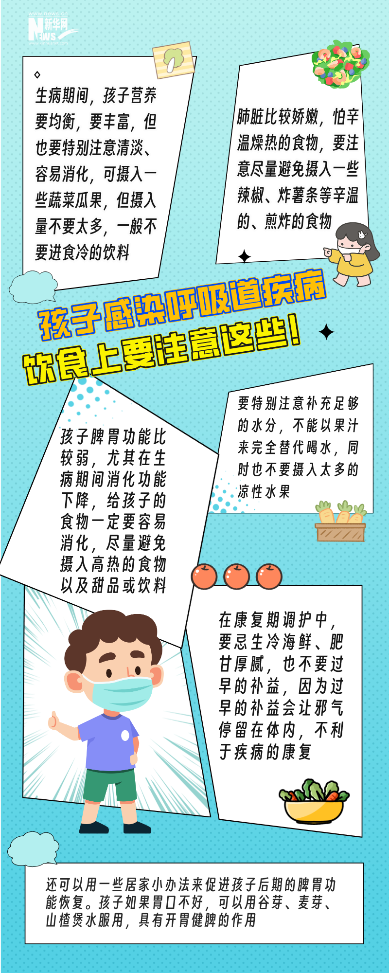 广东省中医院儿科主任杨京华在近日国家卫健委举行的新闻发布会上介绍,针对呼吸道感染的孩子,家长在居家护理的饮食方面要重点关注以下方面 ↓