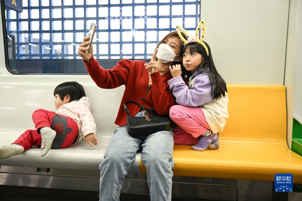 12月9日,市民在越南河内吉灵-河东线轻轨车厢里自拍。