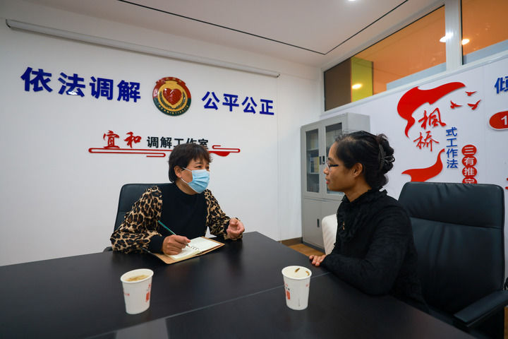 12月8日,在天津市红桥区和苑街道社会矛盾纠纷调处化解中心,金牌调解员在询问群众调解需求。