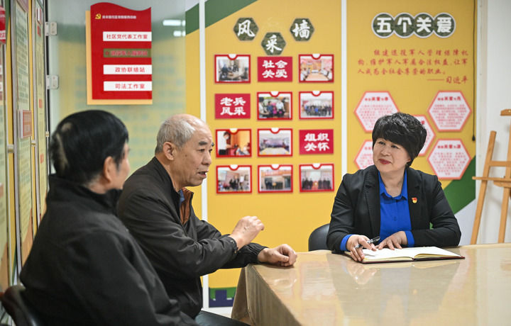 在天津市和平区劝业场街道兆丰路社区“家事驿站”,社区党委书记王玉枝(右)聆听社区邻里协调员的协调情况(12月8日摄)。