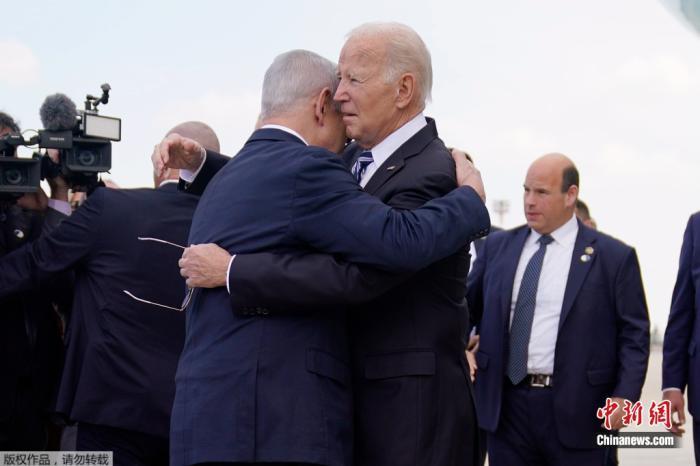当地时间10月18日,美国总统拜登抵达以色列特拉维夫后,与以总理内塔尼亚胡拥抱。