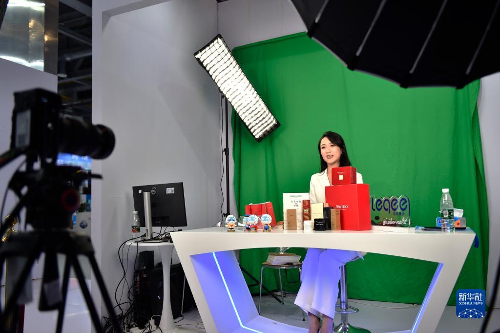 2023年11月23日,在第二届全球数字贸易博览会丝路电商馆,一名主播进行电商直播。新华社记者 刘岭逸 摄