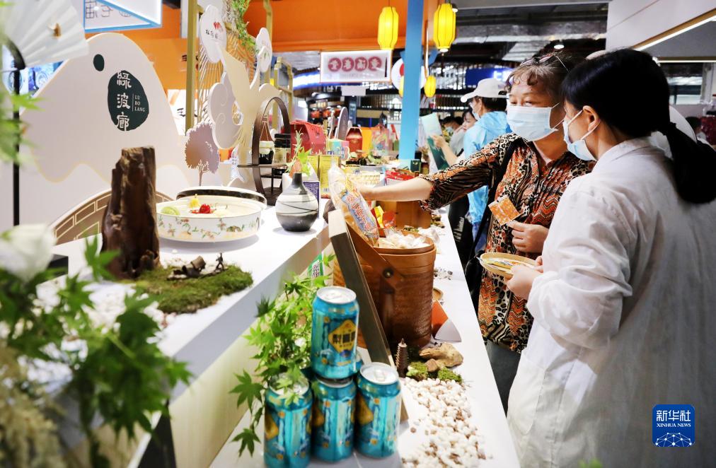 2021年5月29日,参观者在一家豫园老字号饭店展台前挑选商品。当日,全国消费促进月“老字号嘉年华”及第十五届中华老字号博览会在上海世博展览馆举行。新华社记者 方喆 摄