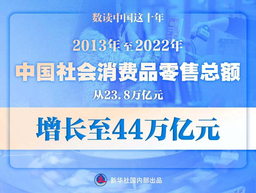 2013年至2022年10年间,中国社会消费品零售总额从23.8万亿元增长至44万亿元,稳居全球第二大消费市场、第一大网络零售市场和全球第二大进口市场。消费“主引擎”动力强劲,为推动高质量发展、创造高品质生活、构建新发展格局提供有力支撑。