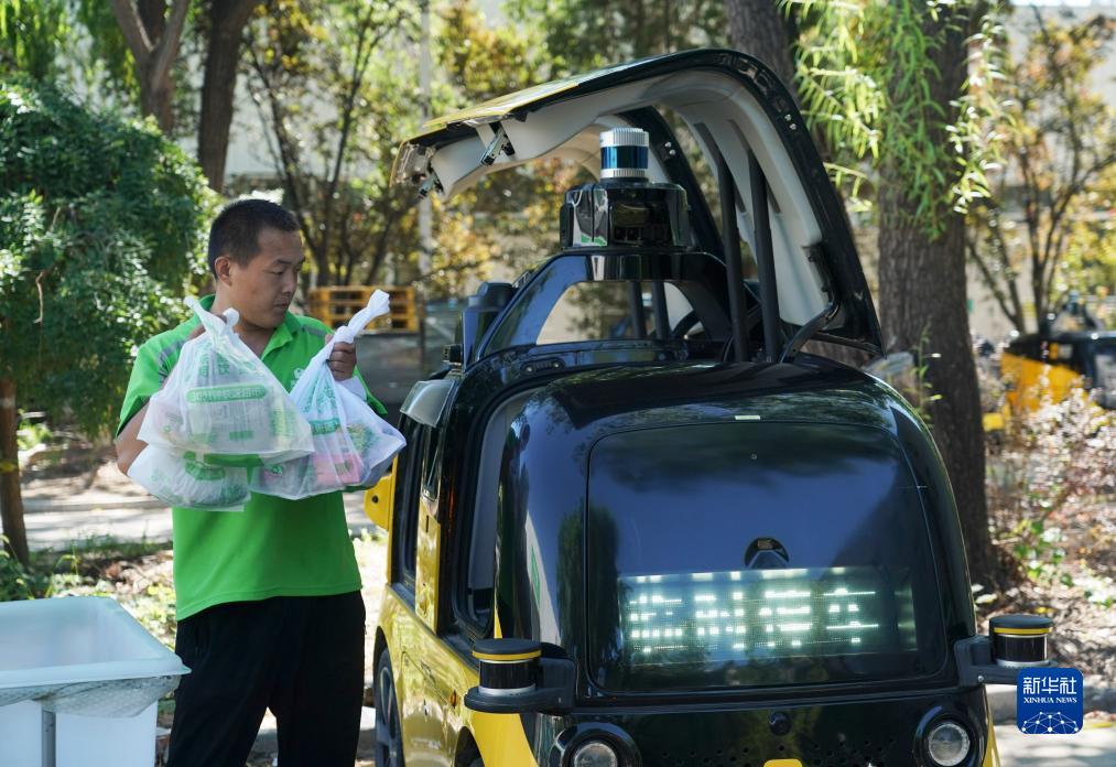 在位于北京市顺义区的一家即时零售平台的前置仓,工作人员将顾客的订单放入自动配送车(2023年8月22日摄)。新华社记者 任超 摄