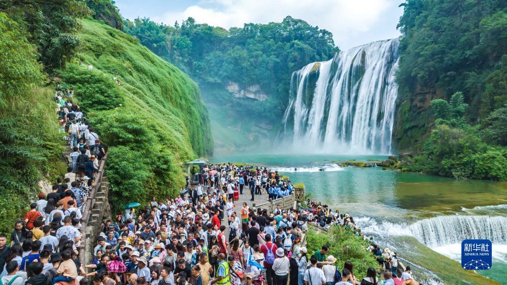 2023年10月3日,游客在贵州省安顺市黄果树瀑布景区游玩(无人机照片)。新华社发(陈熙 摄)