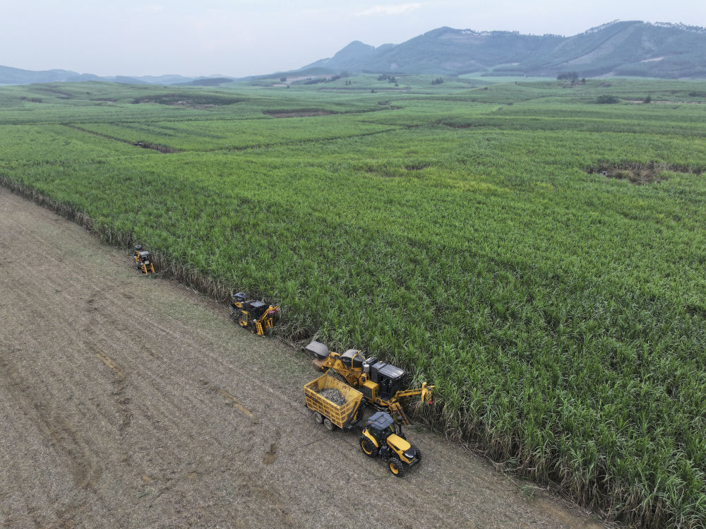 2023年12月14日,在广西来宾市国家现代农业产业园黄安优质“双高”糖料蔗基地,农民驾驶农机收割甘蔗(无人机照片)。新华社记者 周华 摄