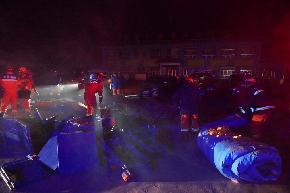 12月19日,在甘肃省临夏回族自治州积石山保安族东乡族撒拉族自治县大河家镇陈家村,救援力量在现场整理物资开展救援。新华社记者 马希平 摄