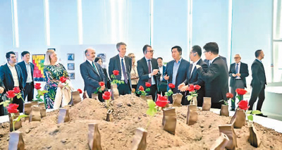 外国驻华使节和外交官在深圳南山能源生态园内的科普教育基地参观艺术作品《岩石里的花》。