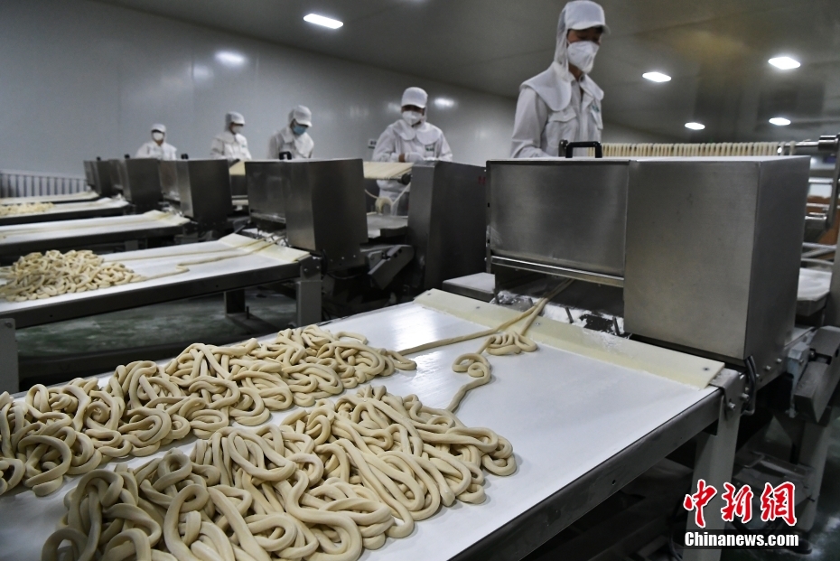 从田间到餐桌,腰站子村的小麦经过深加工形成了一条绿色全产业链,让特色农产品不断提升附加值,身价倍增。图为工人在新疆奇台县半截沟镇腰站子村农业产业园有机手工拉面车间制作挂面。