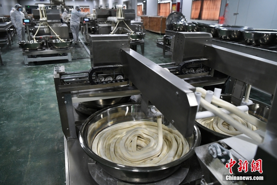 12月20日,工人在新疆奇台县半截沟镇腰站子村农业产业园有机手工拉面车间制作挂面。新疆奇台县是国家优质小麦生产基地,腰站子村以生产优质小麦而闻名,素有“麦村”的美称。