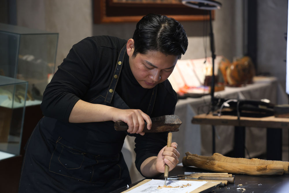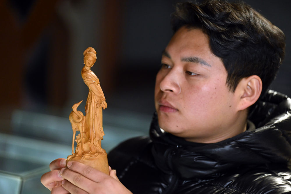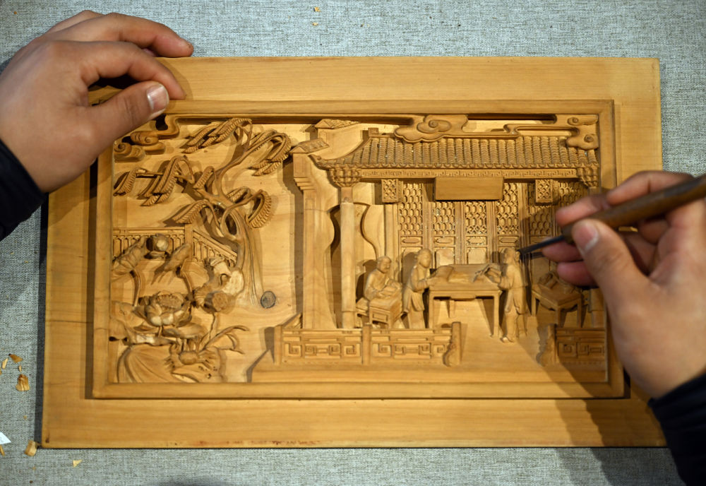 左手持刻刀,右手握木槌,咚咚的敲击声中,木屑纷飞。在“95后”唐蜀辉的刻刀下,平整的木料上渐渐浮现出生动立体的形象:人物、山水、花草……