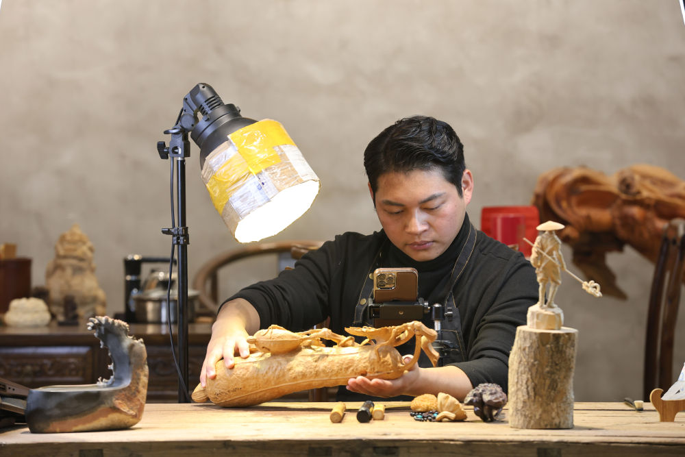 12月14日,唐蜀辉在工作室直播推介木雕产品。新华社发(樊成柱摄)