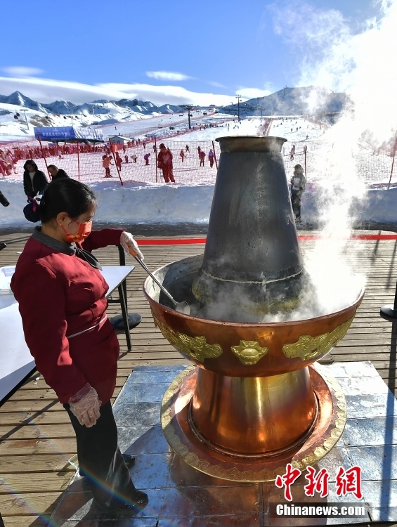 新疆昌吉回族自治州阜康市天山天池国际滑雪场的工作人员在雪场旁支起一口大锅煮饺子,免费送给游客品尝。