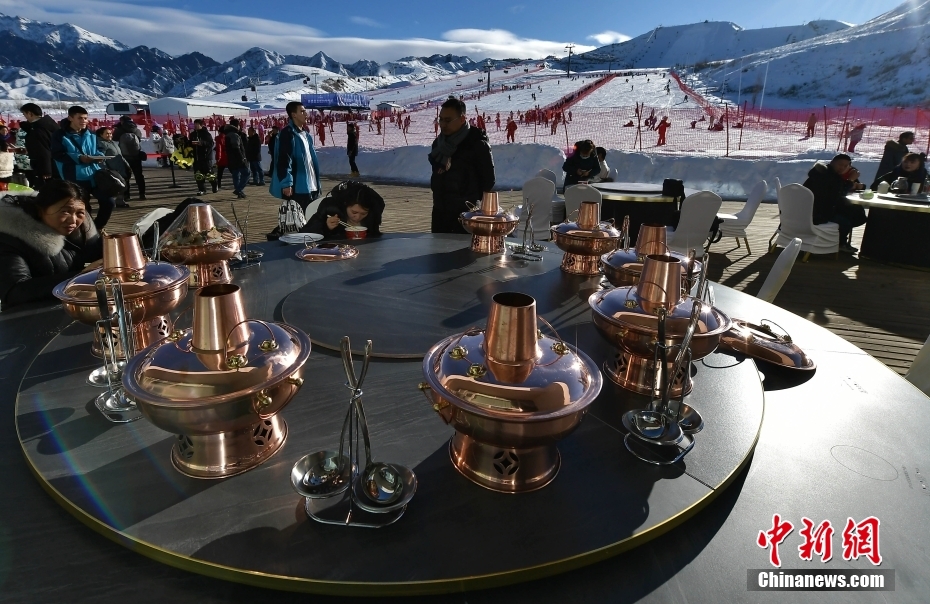 新疆昌吉回族自治州阜康市,天山天池国际滑雪场内开设了的“冰天雪地吃火锅服务”,吸引游客体验。