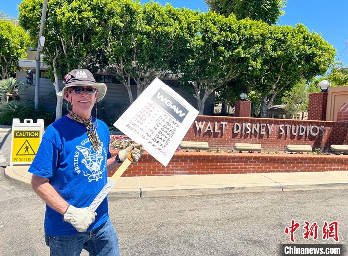 当地时间7月14日,华纳兄弟、迪士尼等美国影视娱乐产业巨头总部门前,罢工者手举标语牌游行示威。中新社记者 张朔 摄