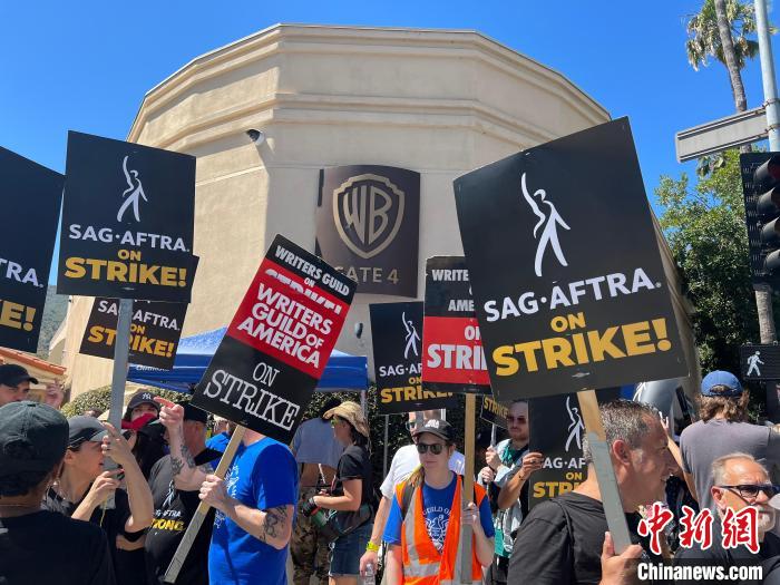 当地时间7月14日上午,华纳兄弟、迪士尼等美国影视娱乐产业巨头总部门前,有成百上千的人高举“罢工”标语牌游行示威。 中新社记者 张朔 摄