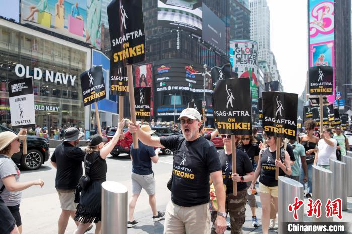 当地时间7月17日,美国纽约时报广场派拉蒙影业公司门前,人们高举“罢工”标语牌游行示威。中新社记者 廖攀 摄